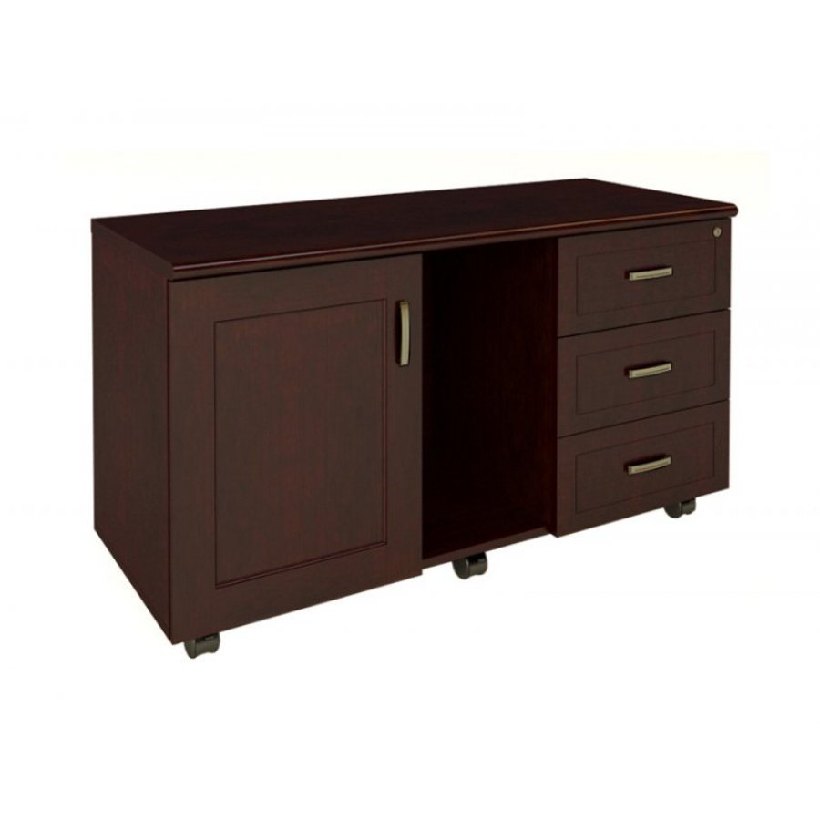 Тумба состоит из каркаса, установленного на 5-ти колесах, полки и фасадных элементов (3 ящики и дверь). Каркас сборной конструкции состоит, включая заднюю стенку, из панелей МДФ толщиной 16 мм, облицованных шпоном. Топ тумбы выполнен из МДФ толщиной 26 мм и имеет на переднем торце полукруглый фрезерованный край. Каркас тумбы соединен при помощи эксцентриковой стяжки и направляющих шкантов. Колесные опоры (5 шт.) из черного пластика, из них две опоры с тормозом. Колеса крепятся к днищу тумбы при помощи шурупов.